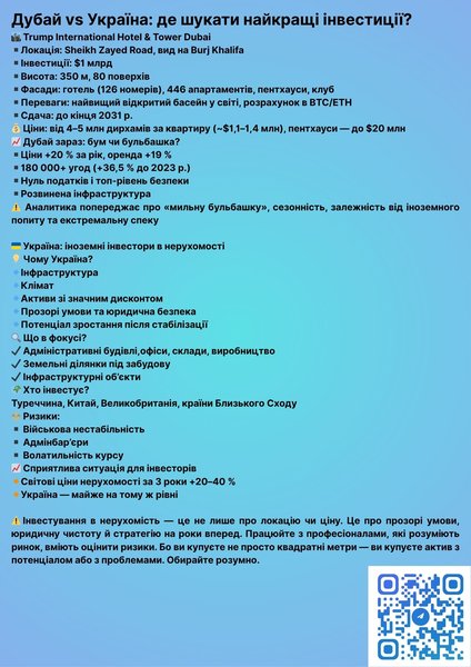 У сучасному інвестиційному ландшафті, де капітал шукає оптимальні точки зростання, інвестори розглядають полярні за своєю природою напрямки, як Дубай та Україна. Кожна з цих юрисдикцій пропонує унікальний набір можливостей та викликів. Дубай, приваблює своїм статусом глобального хабу з розвиненою інфраструктурою, нульовим оподаткуванням доходів та високим рівнем безпеки. Це підтверджується такими масштабними проєктами, як Trump International Hotel & Tower Dubai на Sheikh Zayed Road, що являє собою комплекс з готелем, апартаментами та пентхаусами, що здається в експлуатацію до кінця 2031 року, з інвестиціями в $1 мільярд та цінами, що стартують від $1.1–1.4 мільйона за квартиру. Ринок Дубаю демонструє ріст цін на 20% та оренди на 19% за останній рік, зафіксувавши понад 180 000 угод, що на 36.5% більше, ніж у 2023 році. Однак, аналітики попереджають про потенційну "мильну бульбашку", сезонність ринку, його залежність від іноземного попиту та екстремальні кліматичні умови. Натомість Україна, попри поточні виклики, пропонує іноземним інвесторам значні активи з потенціалом зростання після стабілізації. Привабливість України полягає у її розвиненій інфраструктурі, сприятливому кліматі та, що ключово, у можливості придбання активів зі значним дисконтом. Прозорі умови та юридична безпека, що постійно вдосконалюються, створюють підґрунтя для надійних інвестицій. У фокусі інтересу іноземних інвесторів, серед яких представники Туреччини, Китаю, Великобританії та країн Близького Сходу, перебувають адміністративні будівлі, офіси, складські та виробничі приміщення, земельні ділянки під забудову, а також інфраструктурні об'єкти. Звісно, існують ризики, пов'язані з військовою нестабільністю, адміністративними бар'єрами та волатильністю валютного курсу. Проте, важливо розуміти, що світові ціни на нерухомість за останні три роки зросли на 20–40%, і Україна демонструє динаміку, близьку до цих показників, що свідчить про збереження інвестиційного потенціалу навіть у складних умовах. Інвестування в нерухомість – це не лише питання локації чи цін, а стратегічне рішення, що ґрунтується на прозорих умовах, юридичній чистоті угоди та довгостроковому баченні. Це вимагає залучення професіоналів, які глибоко розуміють ринок, здатні адекватно оцінити ризики та виявити справжній потенціал активу. Адже ви купуєте квадратні метри, а актив, що може стати джерелом прибутку або джерелом проблем.