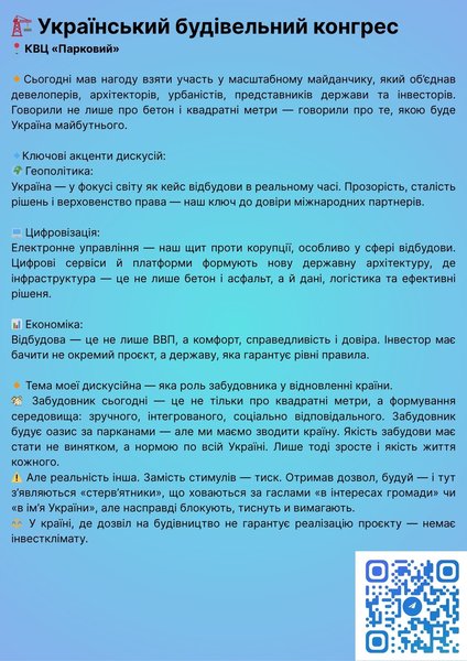 Сьогодні мав нагоду долучитися до масштабного майданчика у КВЦ «Парковий», що об’єднав провідних девелоперів, архітекторів, урбаністів, представників держави та інвесторів. Дискусія виходила далеко за межі питань бетону та квадратних метрів, фокусуючись на ключових аспектах майбутнього України. Ключові акценти дискусій торкалися геополітики, цифровізації та економіки. У геополітичному вимірі Україна перебуває у фокусі світової уваги як унікальний кейс відбудови в реальному часі. Наша здатність забезпечити прозорість, сталість рішень та верховенство права є визначальною для формування довіри міжнародних партнерів. У контексті цифровізації, електронне управління розглядається як ключовий щит проти корупції, особливо у сфері відбудови. Цифрові сервіси та платформи формують нову державну архітектуру, де інфраструктура – це вже не лише фізичні об'єкти, а й дані, ефективна логістика та інноваційні рішення. З економічної точки зору, відбудова – це не тільки зростання ВВП, а й створення комфортного середовища, забезпечення справедливості та відновлення довіри. Інвестор має бачити не лише окремий проєкт, а й державу, яка гарантує рівні правила гри для всіх. Моя дискусія була присвячена ролі забудовника у відновленні країни. Забудовник сьогодні – це значно більше, ніж просто постачальник квадратних метрів. Його місія полягає у формуванні цілісного середовища: зручного, інтегрованого, соціально відповідального. Ми маємо перейти від будівництва окремих "оазисів за парканами" до системного зведення нової країни, де якість забудови стане нормою, а не винятком. Лише тоді якість життя кожного українця зросте. Однак, реальність нерідко дисонує з цими високими цілями. Замість стимулів для розвитку, забудовники стикаються з тиском. Після отримання дозволу на будівництво з'являються ті, хто, ховаючись за гаслами "в інтересах громади" чи "в ім'я України", насправді блокують проєкти, чинять тиск та вимагають. Це створює критичну ситуацію: у країні, де дозвіл на будівництво не гарантує реалізацію проєкту, не може бути повноцінного інвестиційного клімату. Вирішення цієї проблеми є нагальним завданням для забезпечення успішної відбудови.