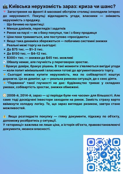 Поточна ситуація на київському ринку нерухомості характеризується значним спадом інтересу з боку покупців, спричиненим загостренням на фронті та масованими обстрілами столиці. Ця динаміка призводить до того, що ринок перебуває на паузі – як з боку покупця, так і продавця. На практиці спостерігається менша кількість дзвінків, переглядів і задатків. Ціни на нерухомість поки що тримаються, але поступово «просідають». Якщо поточна динаміка збережеться, ми побачимо системні знижки. Реальні межі торгу на сьогодні: до $75 тис., можливі знижки від $1 до $3 тис.; до $150 тис.., від $4 до $12 тис.; понад $300 тис., знижки можуть сягати до $45 тис. Обвалу ринку немає, проте гнучкість у переговорах значно зростає. Основними бар'єрами залишаються брак довіри та невизначеність щодо стратегічних рішень. Саме в такі моменти, коли попит мінімальний, а власники готові до аргументованого торгу, з'являються найбільш вигідні угоди. Сьогодні можна придбати нерухомість, собівартість будівництва якої, з огляду на зростання цін на матеріали (збільшення собівартості на 90-115% від початку вторгнення, де імпортна складова вже сягає 35%) та дефіцит кадрів, є вже вищою за поточну ринкову ціну продажу. Це не демпінг, це – реальна ринкова ситуація, в якій є сенс діяти стратегічно. Варто зазначити, що первинний ринок такої гнучкості не дає: будівництво новобудов триває в складних умовах, собівартість зростає, тому знижки тут обмежені.Історія показує, що періоди, подібні до 2008-го, 2014-го років і нинішнього часу, були «не часом» для більшості. Але саме тоді досвідчені інвестори активно заходили на ринок. Замість страху варто ввімкнути холодну логіку. Те, що зараз виглядає ризиком, завтра стане можливістю. Пам'ятайте, на вторинному ринку важлива не лише ціна, а й історія об'єкта, правовстановлюючі документи та нюанси власності. Розумне інвестування в нерухомість сьогодні – це крок у майбутнє.