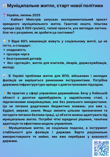 Україна, липень 2025 року. Кабінет Міністрів оголосив про запуск експериментального проєкту орендного муніципального житла. Йдеться про використання грантових коштів, пільгову орендну плату (від 6 000 грн на місяць) та впровадження типових проєктів. Це виглядає логічно і своєчасно, зважаючи на соціальний запит. Але чи є в Україні розуміння, як зробити з цієї ініціативи системну політику, а не залишити її точковою акцією без продовження? Світовий досвід доводить, що муніципальне житло може бути ефективним інструментом, який не створює гетто, а формує нову якість урбаністики. Яскравий приклад, Відень, де 60% мешканців проживають у соціальному житлі. Ці об'єкти працюють за принципами спадковості, прозорої електронної черги та безстрокового договору. Житло надається без прямих дотацій, але з чіткою орієнтацією на вчителів, лікарів, держслужбовців, молодь, ті категорії, які формують основу стабільного суспільства. В Україні проблема забезпечення житлом внутрішньо переміщених осіб, військових і молодих спеціалістів не може бути вирішена виключно ринковими механізмами. Поточна ситуація на ринку, зростання собівартості будівництва та обмежена купівельна спроможність населення вимагають створення державної інфраструктури оренди з довгостроковою логікою. Мій фокус, це нерухомість і державні активи. Щодня працюю з об’єктами по всій Київській області, складами, базами, адміністративними будівлями, комунікаціями. І я бачу: десятки адмінбудівель перебувають у задовільному технічному стані, мають підключені комунікації, але фактично не використовуються. Це не питання нових бюджетних вливань. Усе вже є: будівлі, мережі, земля. Потрібні лише чіткі юридичні рішення, технічна адаптація під житлові функції та ефективна модель управління. Муніципальне житло,це не соціальна подачка, а інструмент стабільності для держави й фахівців. Якщо розглядати його як частину інфраструктури, що вже належить державі, воно може працювати швидко, прозоро та з мінімальними витратами. Питання не в ресурсах, а в системності підходу. Настав час використовувати наявне майно розумно, як інструмент розвитку, а не як баласт. Якщо держава готова до нової житлової політики,вона вже має для цього стартовий капітал у вигляді наявних, але не задіяних активів.