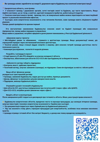 Комунальне та державне майно, це не тягар. Це актив, здатний генерувати прибуток, робочі місця та, що найголовніше, енергетичну стійкість. Сьогодні громади мають ініціювати власні енергопроєкти, як, наприклад, будівництво СЕС в Ірляві, перетворюючи землю, що простоює, на реальний економічний ефект. Юридично чинне законодавство України передбачає чітку логічну послідовність будівництва. Я поділюся з вами моїм 7-кроковим планом, який забезпечує прозорість і захищає інтереси громади. Починати завжди потрібно з визначення Замовника та юридичної основи. Замовником може бути власник майна (громада) або комунальне підприємство (КП), якому майно передано в управління. Критично важливо перевірити, чи зареєстровано право власності чи користування на майбутнього Замовника у Державному реєстрі речових прав. Якщо майно в управлінні КП, необхідно оформити делегування повноважень Замовника у Єдиному реєстрі будівельної діяльності (ЄДЕССБ), без цього кроку подальший рух неможливий. Наступний етап, формування вихідних даних, куди входить отримання Містобудівних умов та обмежень (МУО). Для енергооб’єктів поза межами населених пунктів МУО може замінити мотивований висновок архітектора про можливість розміщення, що також є підставою для зміни цільового призначення землі на енергетику. Щодо Технічних умов (ТУ): вони потрібні, якщо СЕС віддає енергію в мережу. Для об’єктів, що забезпечують лише власні потреби, ТУ не потрібні, але це має бути підтверджено листом-поясненням в ЄДЕССБ. Також обов’язково проведіть геологічні та геодезичні вишукування. Далі йде розробка та затвердження проєкту. Проєктувальник обирає стадійність проєктування (П, РП або П+Р). Експертиза проєкту є обов'язковою для класів наслідків СС2 та СС3, а для СС1 вона стає обов’язковою лише у двох випадках: при фінансуванні за рахунок бюджетних коштів або якщо ділянка має складні інженерно-геологічні умови. Після експертизи Замовник затверджує проєкт наказом і завантажує його та звіт до ЄДЕССБ. Паралельно забезпечується нагляд і контроль якості: призначається Авторський нагляд та Технічний нагляд, який має бути залучений Замовником (громадою), а не підрядником, і який відповідає за якість та обсяги робіт. Ключовим моментом є юридична схема залучення донорів. Щоб отримати об’єкт без бюджетних витрат та уникнути публічних закупівель, ми радимо укладати понятійний тристоронній договір, де Громада виступає Замовником будівництва (у містобудівному розумінні: отримує дозволи), Донор, фінансовим інструментом (фінансує підрядника), а Підрядник виконує роботи. Донор передає готовий об'єкт громаді в якості пожертви. Після підготовки всієї документації здійснюється отримання права на будівництво: для СС1, реєстрація Повідомлення про початок робіт; для СС2-СС3, отримання Дозволу на початок робіт (виключно через "Дію"). Завершальний етап, введення в експлуатацію та реєстрація. Після виконання всіх робіт подається Декларація про готовність об’єкта, а фінальний кро реєстрація права власності на збудовану СЕС. Юридична прозорість, забезпечена коректною роботою з ЄДЕССБ, є магнітом для інвесторів і посилює енергетичну незалежність України вже сьогодні.